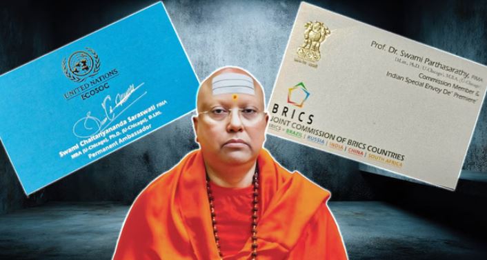 दिल्ली पुलिस ने बाबा चैतन्यानंद के फर्जीवाड़े का खुलास किया है। स्वामी चैतन्यानंद के पास से दो विजिटिंग कार्ड बरामद किए हैं। पहले कार्ड में बाबा खुद को संयुक्त राष्ट्र का स्थायी राजदूत बताता है। दूसरा विजिटंग कार्ड ब्रिक्स का है, जिसमें चैतन्यनंद ने खुद को कमीशन का मेम्बर और इंडियन स्पेशल एनवोय (राजदूत) बताया है। इन फर्जी कार्ड का इस्तेमाल बाबा अपना रुतबा दिखाने और लोगों को गुमराह करने के लिए करता था।