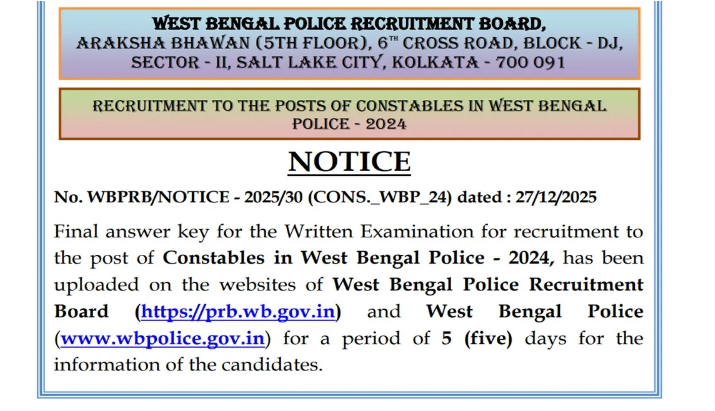 वेस्ट बंगाल पुलिस कॉन्स्टेबल फाइनल आसंर-की जारी, रिजल्ट जल्द आने की उम्मीद