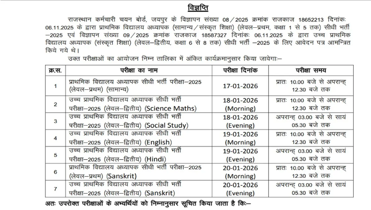 राजस्थान कर्मचारी चयन बोर्ड की ओर से प्राथमिक विद्यालय और उच्च प्राथमिक विद्यालय के लिए परीक्षा का आयोजन 17, 18, 19 और 20 जनवरी, 2026 को किया जाएगा। यह परीक्षा एक शिफ्ट में सुबह 10 बजे से लेकर दोपहर 12.30 बजे तक आयोजित कराई जाएगी। इसके अलावा, 19 और 20 जनवरी, 2026 को परीक्षा दोपहर 3 बजे से लेकर शाम 5.30 बजे तक आयोजित कराई जाएगी।